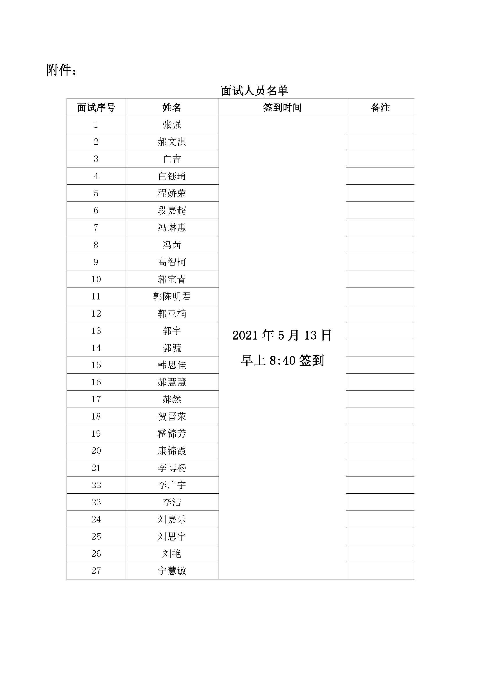 1、面試時間:2021年5月13日(周四)上午9:00。本次面試分為兩組,簽到時間不同,請各位考生自行查看附件表。